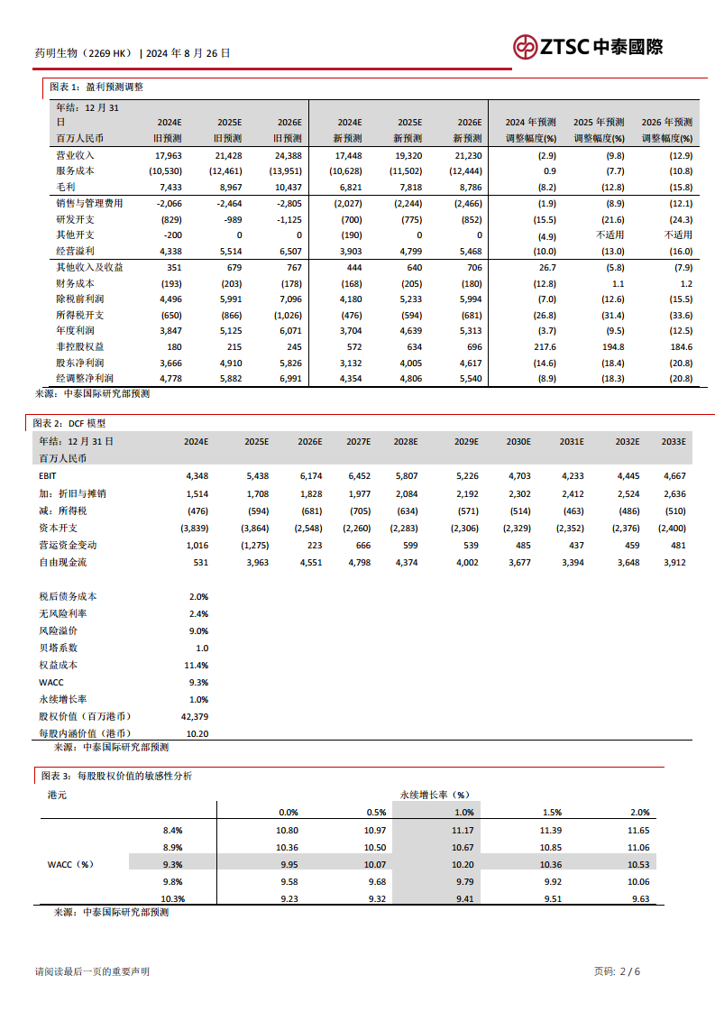 DCF模型显示,药明生物的股权价值为42,379百万港币,每股内涵价值为10.20港币。模型关键参数包括税后债务成本2.0%,无风险利率2.4%,风险溢价9.0%,贝塔系数1.0,权益成本11.4%,加权平均资本成本(WACC)9.3%,永续增长率1.0%。