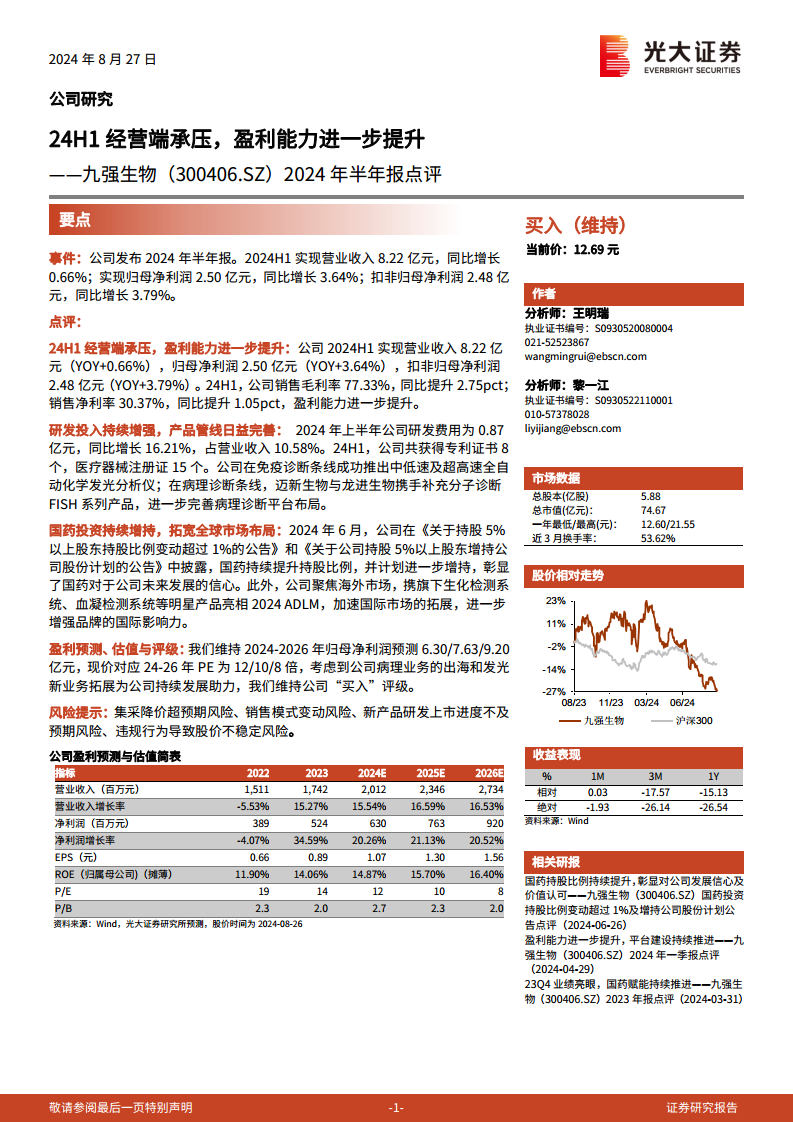 九强生物在2024年上半年展现出在经营压力下逆势提升盈利能力的韧性,通过精细化管理实现了净利润的稳健增长,并显著提升了毛利率和净利率。公司持续加大研发投入,不断丰富和完善产品管线,尤其在免疫诊断和病理诊断领域取得了重要进展。此外,主要股东国药投资的持续增持以及公司积极拓展全球市场的战略,都为九强生物的长期发展注入了信心和动力。尽管面临市场风险,但基于其核心业务的持续发展和新业务的拓展潜力,公司未来盈利能力有望继续提升,维持“买入”评级。