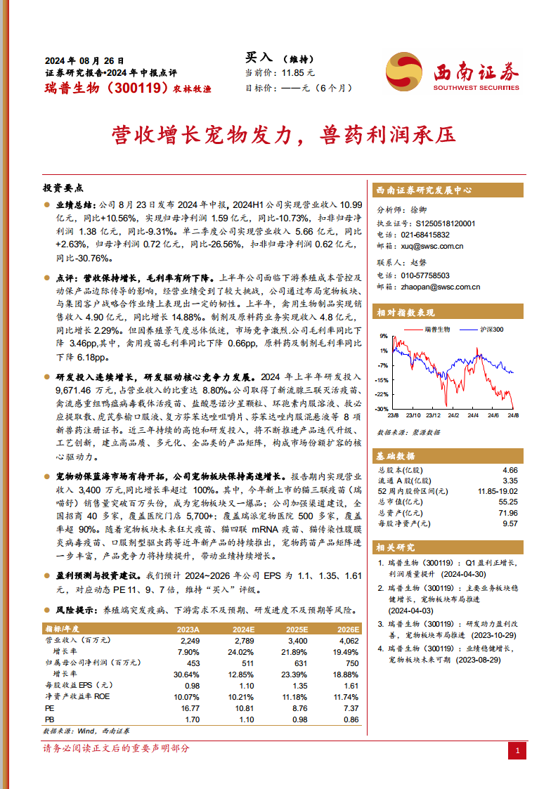 瑞普生物于2024年8月23日发布2024年中报,报告期内公司实现营业收入10.99亿元,同比显著增长10.56%。然而,归属于母公司股东的净利润为1.59亿元,同比下降10.73%;扣除非经常性损益后的归母净利润为1.38亿元,同比下降9.31%。这反映出公司在营收扩张的同时,盈利能力受到一定挑战。