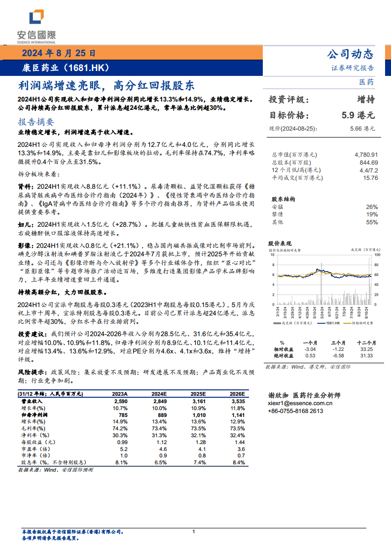 康臣药业在2024年上半年实现了稳健的业绩增长,收入和归母净利润分别同比增长13.3%和14.9%,利润增速高于收入增速,显示出其良好的盈利能力和运营效率。公司各业务板块均表现良好:肾科业务凭借权威指南推荐保持稳定增长;妇儿板块受益于医保政策机遇实现高速增长;影像板块则通过新产品上市和积极的市场推广活动重回上升通道,未来增长潜力显著。此外,公司持续通过高额分红回报股东,累计派息超24亿港元,派息比例常年超30%,在行业内处于领先水平。分析师维持“增持”评级,并预计公司未来几年收入和归母净利润将持续增长,估值水平较低,具备投资价值。同时,报告也提示了政策、集采、研发进展、产品商业化及行业竞争加剧等潜在风险,建议投资者关注。