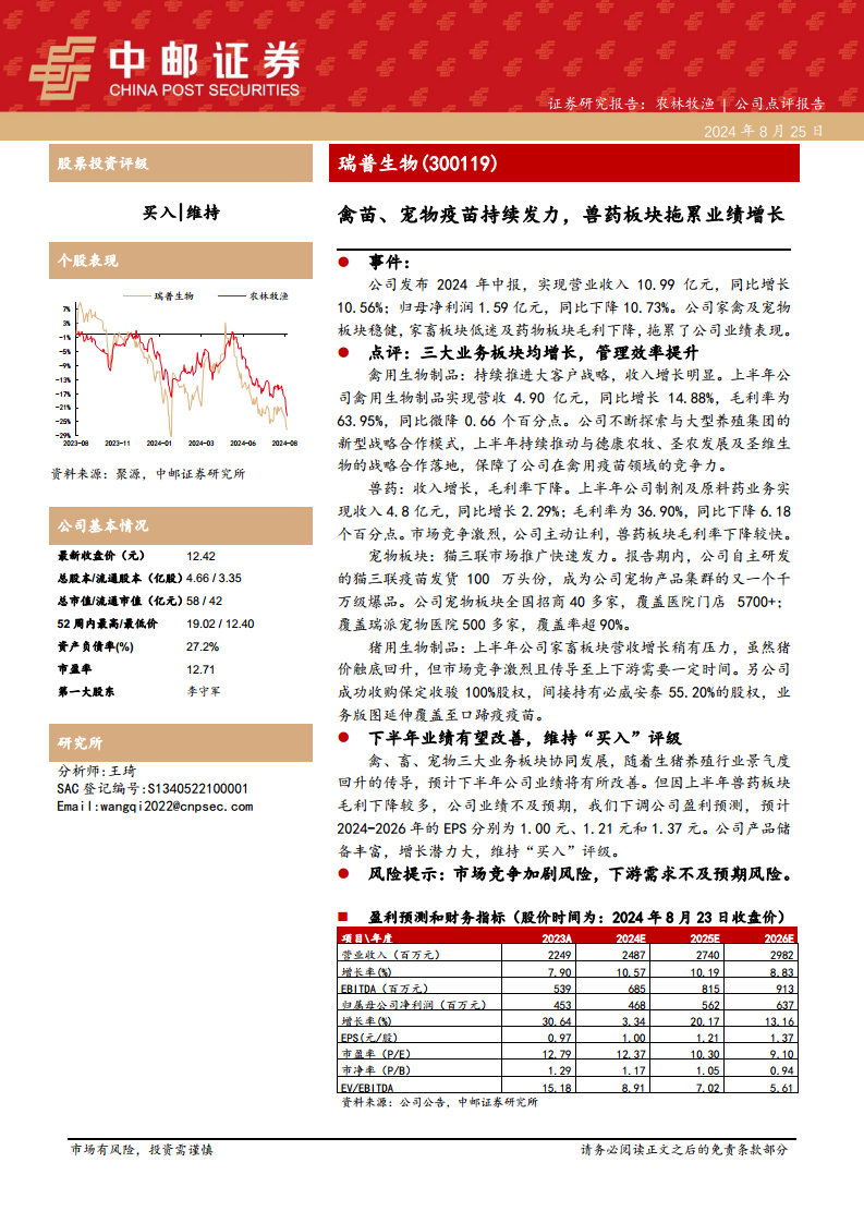 瑞普生物2024年上半年营收实现增长,但受兽药板块毛利率下降和家畜板块低迷影响,净利润出现下滑。公司在禽用生物制品和宠物疫苗领域表现强劲,特别是猫三联疫苗成为新的增长点,并通过战略合作和收购拓展了业务版图。尽管上半年业绩不及预期导致盈利预测下调,但分析认为下半年随着生猪养殖行业景气度回升,公司业绩有望改善。基于丰富的产品储备和增长潜力,中邮证券维持“买入”评级,并提示市场竞争加剧和下游需求不及预期的风险。
