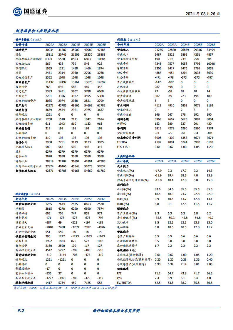 分析师认为,恒瑞医药已逐渐走出集采的集中影响。随着创新药商业化梯队的持续丰富,创新药销售收入占比预计将进一步提升,从而拉动公司长期发展。海外布局则为公司开辟了更广阔的市场空间。公司平台布局扎实、创新研发有序、综合实力稳健,其优秀的研发能力、深远的国际化视角以及强劲的市场销售能力,预示着深度蜕变值得期待。考虑到公司上半年已确认1.6亿欧元首付款,以及2024年内有望确认的GLP-1系列产品授权潜在1亿美元首付款,分析师上调了盈利预测。预计公司2024-2026年归母净利润分别为63.58亿元、66.74亿元、76.74亿元,同比增长分别为47.8%、5.0%、15.0%,对应PE分别为44X、42X、36X,维持“买入”评级。