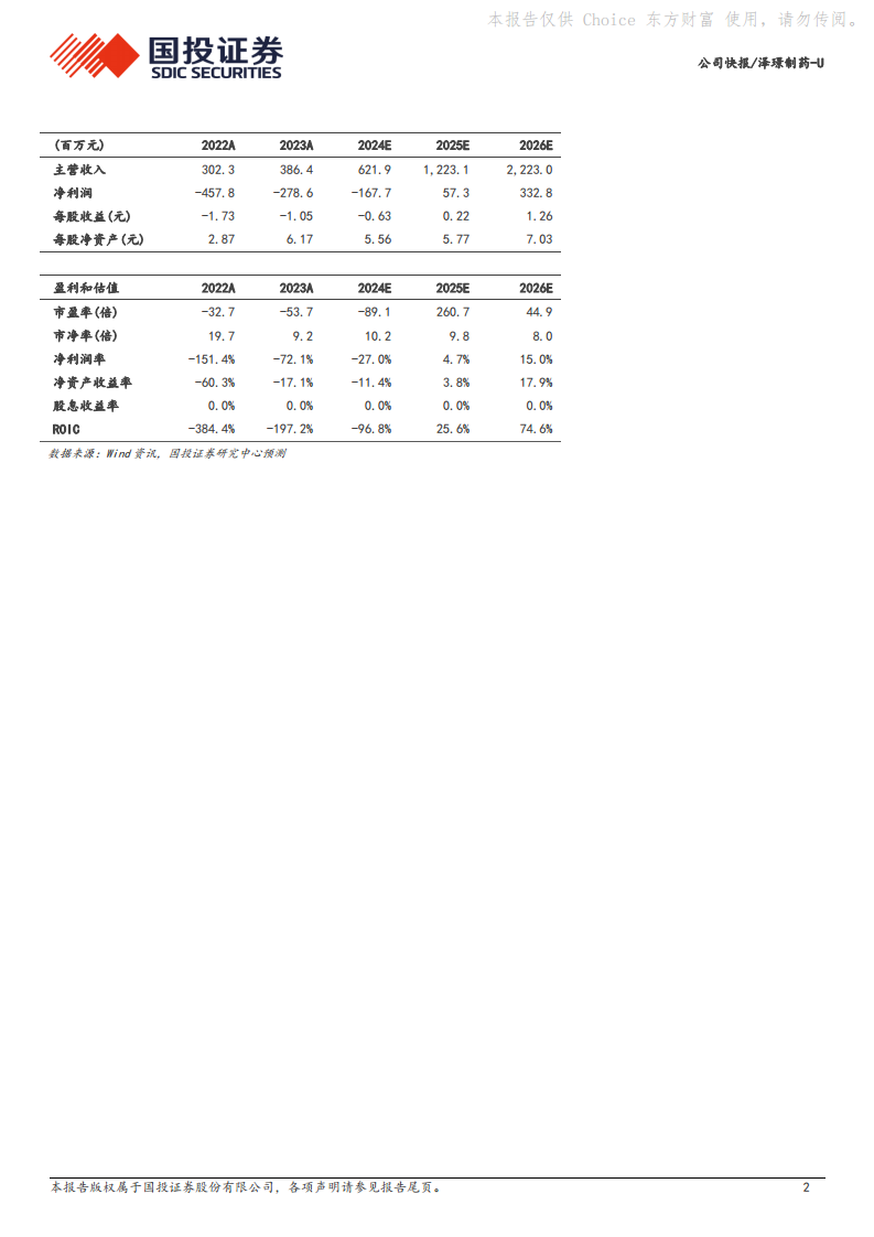 根据国投证券研究中心的预测,泽璟制药-U的收入将实现高速增长:预计2024年为6.22亿元,2025年为12.23亿元,2026年将达到22.23亿元。在净利润方面,预计公司将在2025年实现扭亏为盈,2024年净利润预计为-1.68亿元,2025年为0.57亿元,2026年将大幅增至3.33亿元,显示出明确的盈利改善趋势。