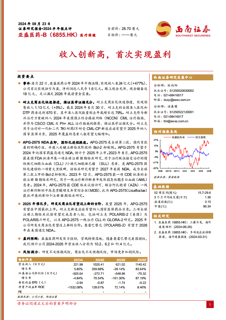 亚盛医药在2024年上半年实现了显著的财务好转,收入创历史新高并首次实现盈利,同时保持充裕的现金储备,为未来的研发和商业化活动提供了坚实基础。