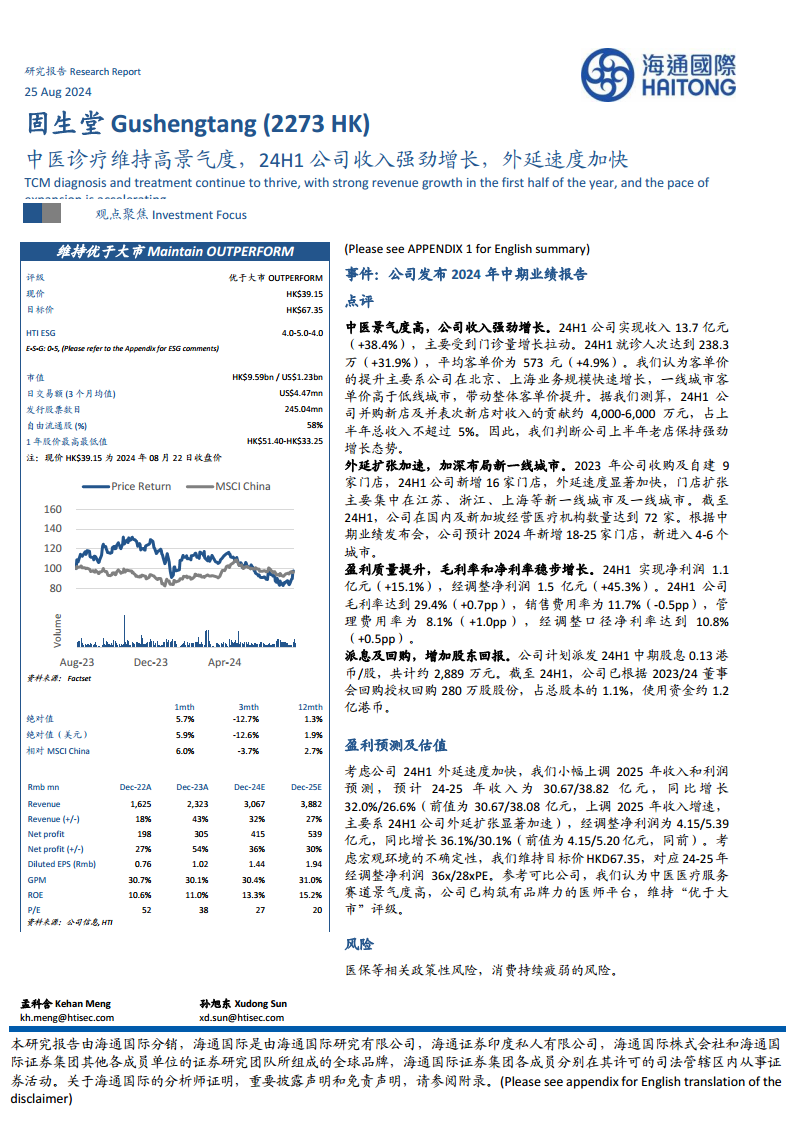 固生堂在2024年上半年取得了显著的业绩增长,收入和就诊人次均实现强劲提升,客单价因一线城市业务拓展而优化。公司通过加速门店扩张,特别是在新一线和一线城市的布局,进一步扩大了市场份额。同时,盈利质量持续改善,毛利率和调整后净利率稳步增长。公司积极通过派发股息和股份回购来提升股东回报。基于其在景气度高的中医医疗服务赛道的领先地位和品牌医师平台,分析师上调了2025年收入和利润预测,并维持“优于大市”的投资评级,目标价为HKD67.35。投资者需关注医保政策变化及消费市场持续疲弱的潜在风险。