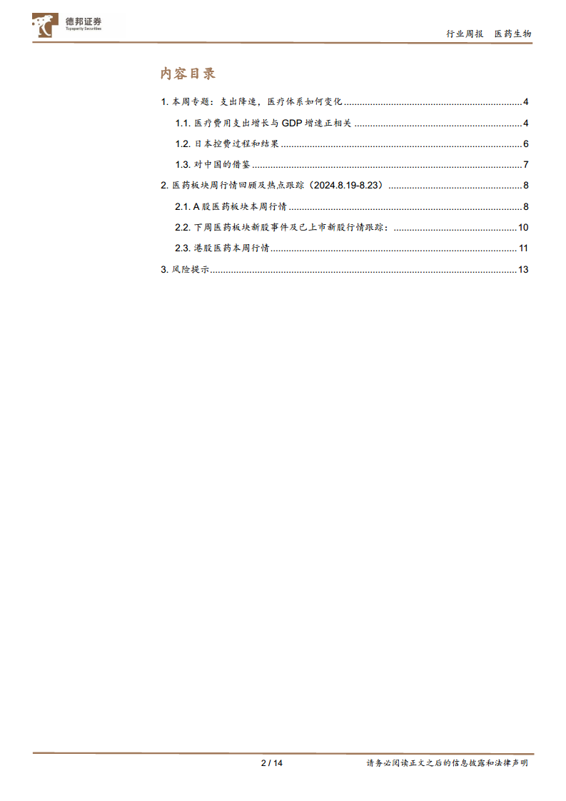 对中国的借鉴意义在于:首先,经济增速与医疗费用支出增速息息相关,中国在经济增速放缓后,医疗费用支出增速也将面临压力。其次,费用控制是一个长期、复杂的系统工程,需要多方面入手,短期冲击可控,但长期来看,费用整体增速将放缓,费用结构将因政策调整而发生结构性变化。最后,长期来看,中国医药行业存在结构性机会,包括与人工服务相关的医疗服务(如康复、手术)、与老年人需求相关的费用支出(如护理)、运营能力更强的医疗机构,以及具备创新能力或出海潜力的新药。报告建议关注具备明确定位或更强运营能力的标的(如固生堂、海吉亚医疗、三星医疗),以及具备较强创新能力或出海能力的创新药标的(如和黄医药、百济神州、海思科)。