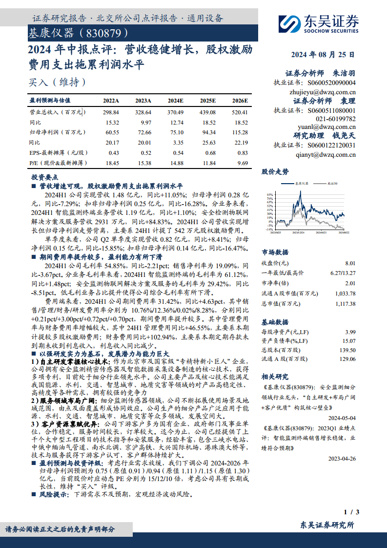 基康仪器在2024年上半年实现了营收的稳健增长,但受股权激励费用计提和期间费用率上升的影响,短期内利润水平承压,盈利能力有所下滑。尽管如此,公司凭借其在安全监测领域的强大自主研发实力、广泛的市场布局和优质的客户基础,展现出显著的长期发展潜力。分析师据此调整了未来三年的盈利预测,但仍维持“买入”评级,强调其长期成长价值,并提示了下游需求和宏观经济波动风险。