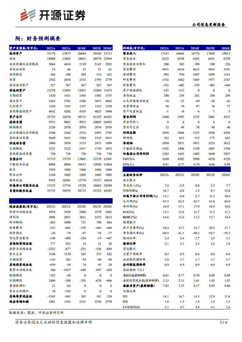 基于左沙集采带来的负面影响,开源证券下调了健康元2024-2026年的归母净利润预测,但鉴于公司在吸入制剂领域的领先地位、创新药的研发进展以及高壁垒制剂的上市预期,维持“买入”评级。预计随着集采负面影响出清及新品种放量,公司价值属性将进一步凸显。