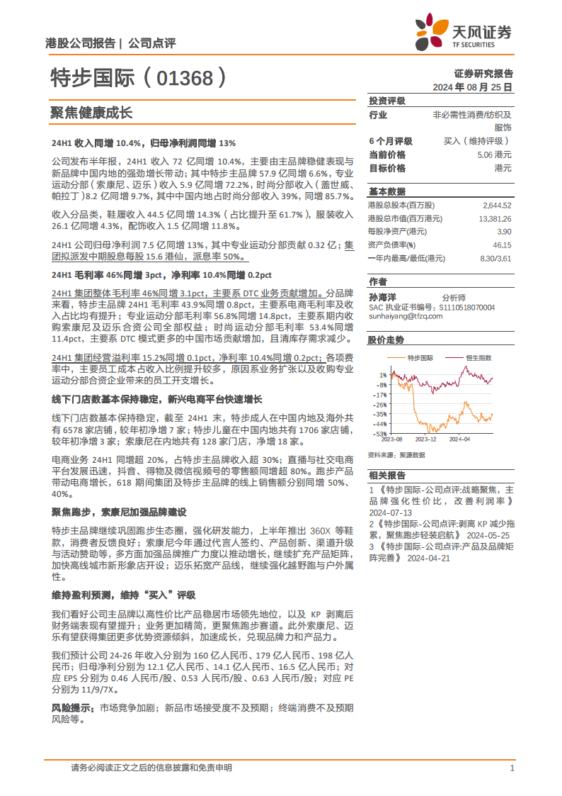 综合来看,特步国际在2024年上半年展现出强劲的增长势头和优化的盈利结构。公司主品牌以高性价比产品稳居市场领先地位,而KP剥离后业务更加精简,进一步聚焦跑步赛道。索康尼和迈乐等专业运动品牌有望获得集团更多优势资源倾斜,加速成长,兑现品牌力和产品力。分析师维持对特步国际的“买入”评级,并预计公司2024-2026年收入将分别达到160亿、179亿和198亿人民币,归母净利润分别为12.1亿、14.1亿和16.5亿人民币,对应EPS分别为0.46、0.53和0.63人民币/股,对应PE分别为11/9/7X。尽管存在市场竞争加剧、新品市场接受度不及预期以及终端消费不及预期等风险,但公司多品牌战略的成功实施和对跑步赛道的持续深耕,为其未来的健康成长奠定了坚实基础。