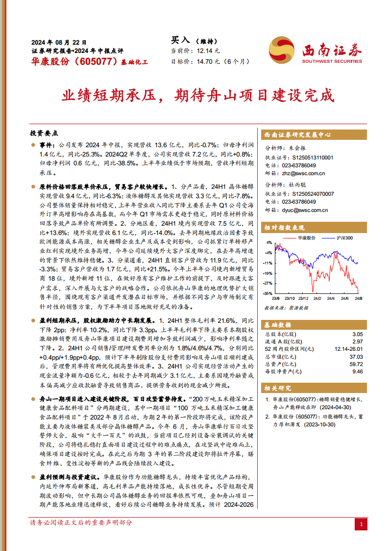 西南证券认为,华康股份作为功能糖醇行业的龙头企业,持续丰富和优化产品结构,积极布局新赛道,随着高毛利单品产能的持续落地,公司具备优异的成长性。尽管短期内受周期波动影响,但中长期来看,晶体糖醇业务的回报率依然可观,且舟山项目一期产能的落地将迅速释放业绩。 预计公司2024-2026年归母净利润分别为3.0亿元、3.8亿元、4.4亿元,对应每股收益(EPS)分别为0.98元、1.26元、1.45元。参考可比公司(百龙创园、晨光生物)的估值水平,报告给予公司2024年15倍估值,对应目标价14.7元,维持“买入”评级。