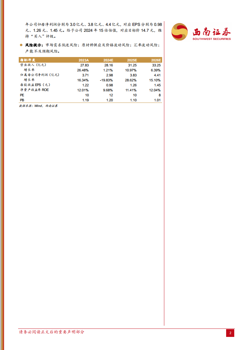 报告提示了多项潜在风险,包括市场需求低迷风险、原材料供应及价格波动风险、汇率波动风险以及产能不及预期风险,这些因素可能对公司未来的经营业绩产生不利影响。