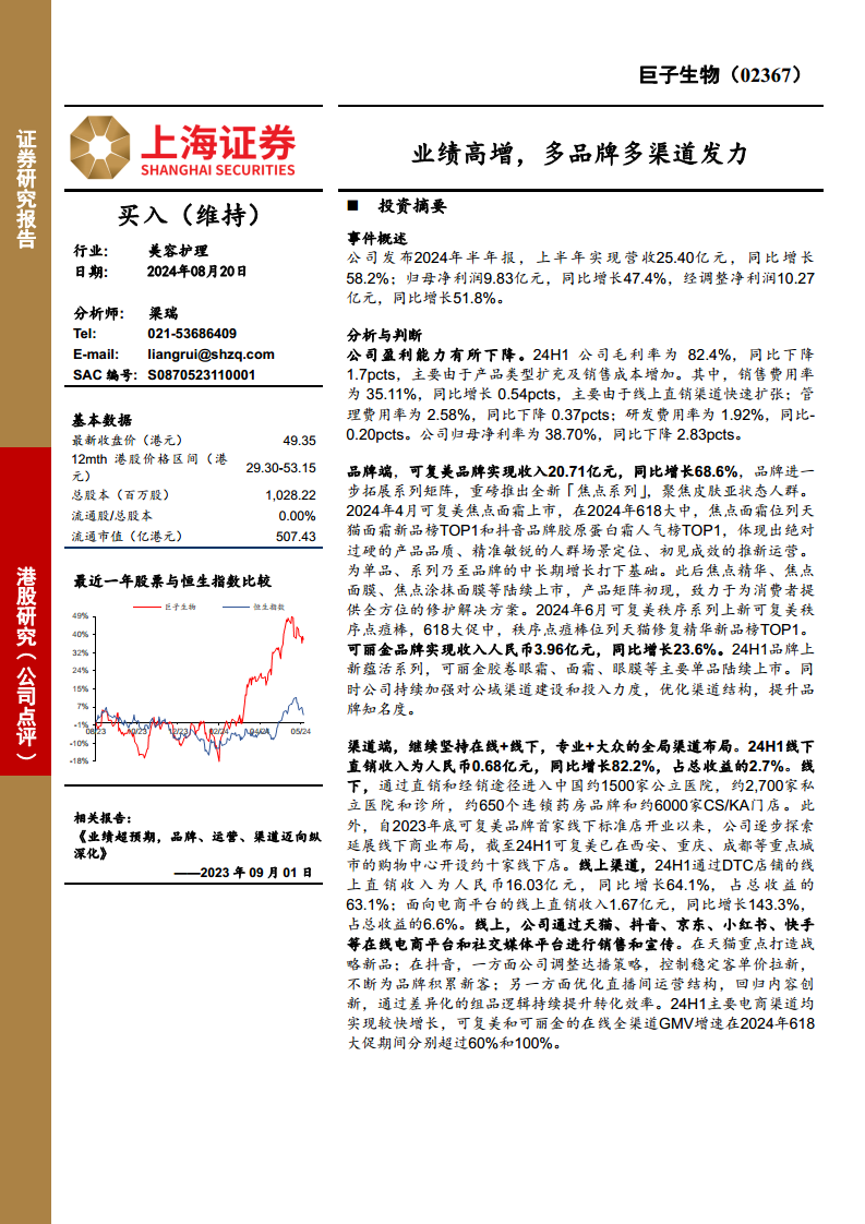 巨子生物在2024年上半年实现了显著的业绩增长,营收和净利润均保持高速增长,这主要得益于其成功的“可复美”和“可丽金”多品牌战略以及线上线下融合的全渠道布局。尽管公司在报告期内面临毛利率和净利率的轻微下降,但其在产品创新、市场拓展和渠道运营方面的强劲表现,特别是“可复美”新产品的市场成功和“618”大促的优异成绩,为未来的持续增长奠定了坚实基础。分析师对公司未来业绩持乐观预期,并维持“买入”评级,但投资者仍需关注行业渗透率、新产品开发及政策变化等潜在风险。