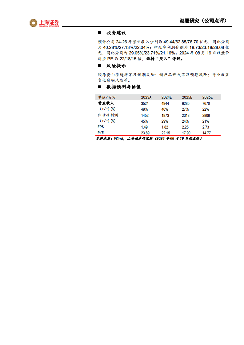 上海证券维持对巨子生物的“买入”评级。预计公司2024-2026年营业收入分别为49.44亿元、62.85亿元和76.70亿元,同比增速分别为40.28%、27.13%和22.04%。归母净利润预计分别为18.73亿元、23.18亿元和28.08亿元,同比增速分别为29.05%、23.71%和21.16%。基于2024年8月19日收盘价,对应PE分别为22倍、18倍和15倍。 同时,报告提示了潜在风险,包括胶原蛋白渗透率不及预期风险、新产品开发不及预期风险以及行业政策变化影响风险。