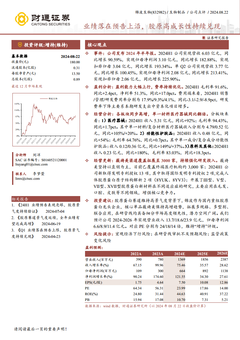 锦波生物发布2024年半年报,业绩表现亮眼,各项关键指标均落在预告上沿,充分体现了公司强劲的增长势头。