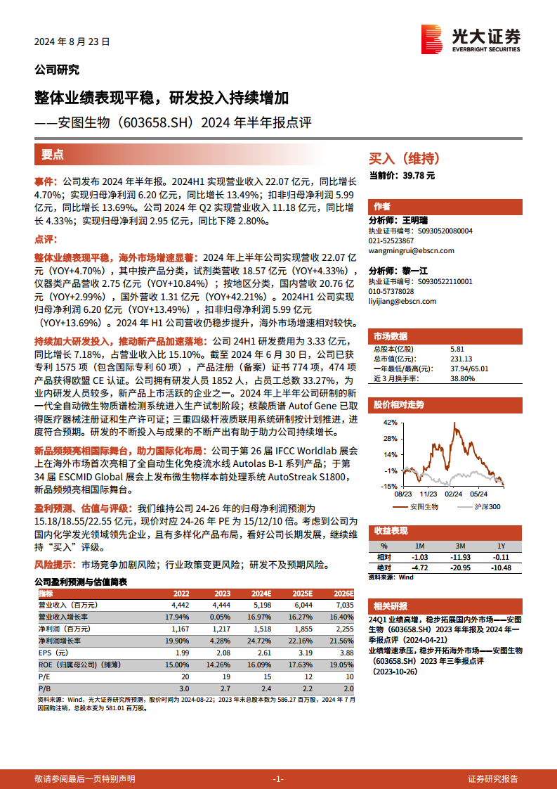 安图生物在2024年上半年展现出稳健的经营态势,营业收入和归母净利润均实现增长,尤其海外市场表现亮眼,增速达到42.21%。公司持续高强度投入研发,研发费用占比超过15%,并成功推动多款创新产品进入关键阶段或获得注册,如新一代全自动微生物质谱检测系统和核酸质谱Autof Gene。同时,公司积极拓展国际市场,通过在IFCC Worldlab和ESCMID Global等国际展会亮相新品,进一步提升了全球竞争力。基于其在国内化学发光领域的领先地位和多元化产品布局,分析师维持“买入”评级,并对公司未来盈利能力持乐观预期,但提示了市场竞争、政策变化和研发进展等潜在风险。