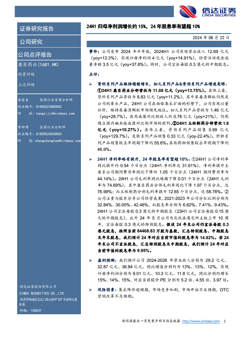 康臣药业(01681):24H1归母净利润增长约15%,24年股息率有望超10%