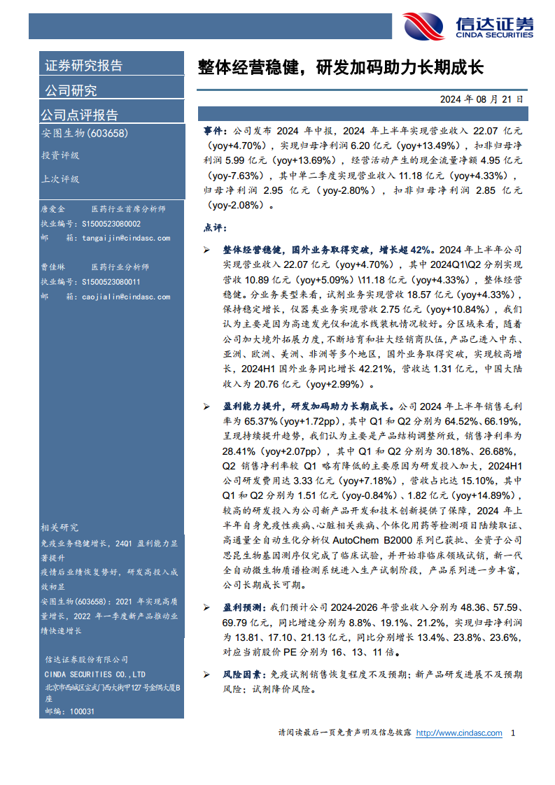 安图生物在2024年上半年表现出稳健的经营态势,营业收入和归母净利润均实现增长。公司在国际市场拓展方面取得显著成效,国外业务实现超过42%的高速增长。同时,公司持续加大研发投入,上半年研发费用占营收比重达15.10%,为新产品开发和技术创新提供了有力支撑,并已有多项新产品和技术取得进展,预示着公司长期成长潜力。尽管面临免疫试剂销售恢复、新产品研发进展和试剂降价等风险,但基于当前的经营表现和研发投入,分析师对公司未来几年的业绩增长持乐观态度,预计2024-2026年营收和归母净利润将持续增长。