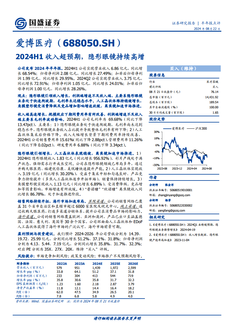 爱博医疗(688050):2024H1收入超预期,隐形眼镜持续高增