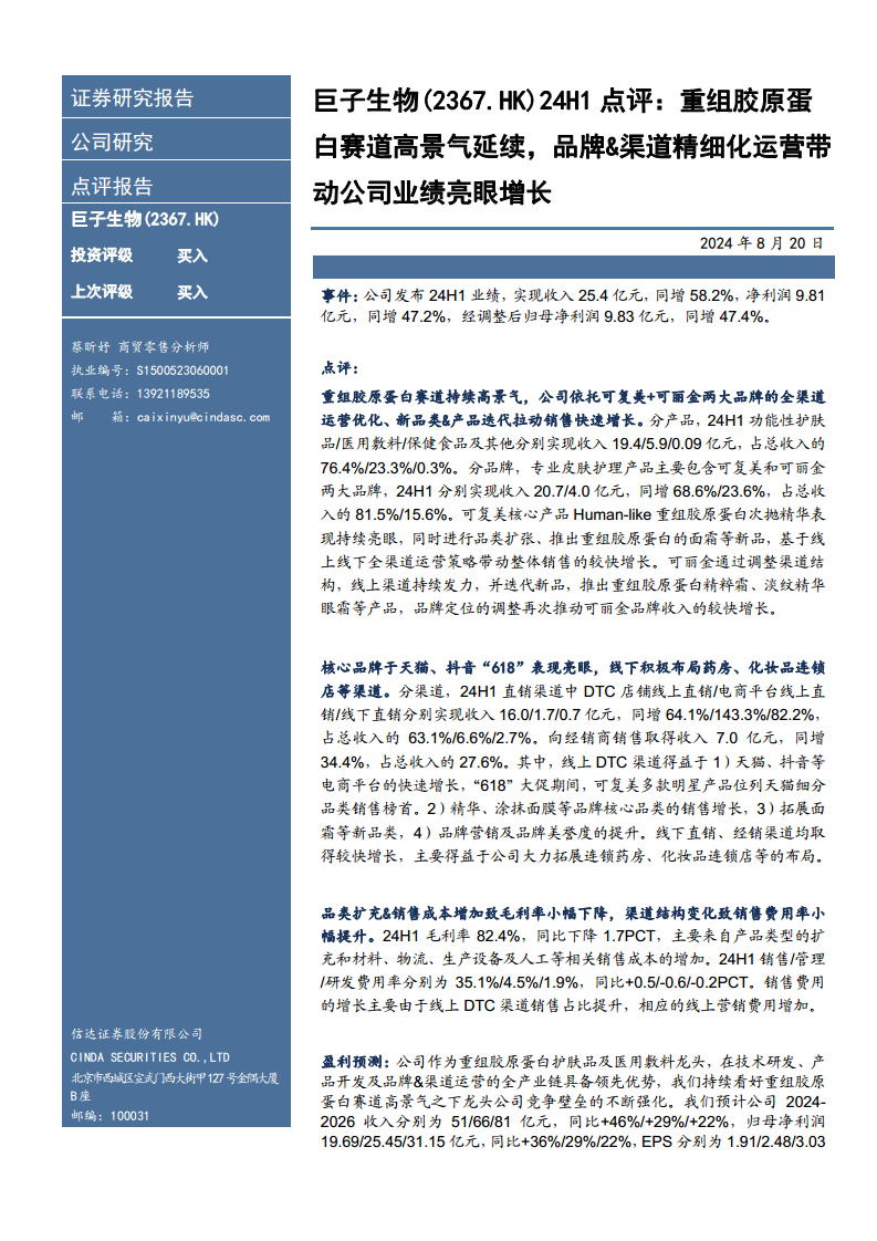 巨子生物在2024年上半年取得了卓越的财务业绩,收入和净利润均实现高速增长,充分展现了重组胶原蛋白赛道的强劲活力和公司作为行业龙头的领先优势。公司通过可复美和可丽金两大核心品牌的持续创新和精细化运营,以及线上DTC渠道的爆发式增长和线下渠道的积极拓展,有效驱动了销售业绩的提升。尽管毛利率因产品扩充和成本增加略有下降,但整体盈利能力依然强劲,费用结构也显示出优化趋势。信达证券维持“买入”评级,并对公司未来几年的收入和净利润增长持乐观预期,认为其在技术研发、产品开发和全渠道运营方面的领先优势将持续巩固其市场地位。