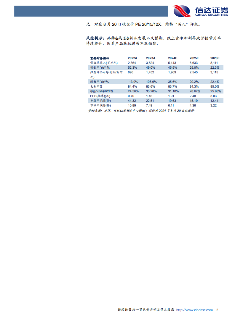 基于对公司核心竞争力和市场前景的判断,信达证券预测巨子生物2024年至2026年的收入将分别达到51亿元、66亿元和81亿元,同比增速分别为46%、29%和22%。归属于母公司净利润预计分别为19.69亿元、25.45亿元和31.15亿元,同比增速分别为36%、29%和22%。对应的每股收益(EPS)分别为1.91元、2.48元和3.03元。按照2024年8月20日收盘价计算,对应的市盈率(PE)分别为20倍、15倍和12倍。