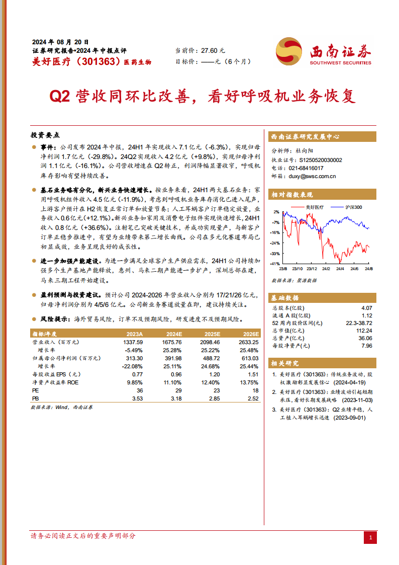 美好医疗发布2024年中报,上半年实现收入7.1亿元,同比下降6.3%;实现归母净利润1.7亿元,同比下降29.8%。然而,2024年第二季度表现显著改善,实现收入4.2亿元,同比增长9.8%,归母净利润1.1亿元,同比下降16.1%。这表明公司营收增速在Q2转正,利润降幅大幅收窄,呼吸机库存消化影响有望持续改善。