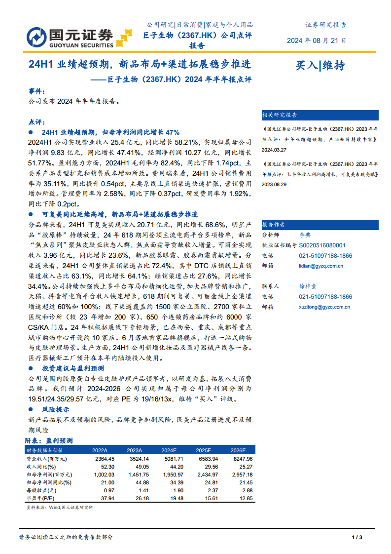 巨子生物(02367):2024年半年报点评:24H1业绩超预期,新品布局+渠道拓展稳步推进
