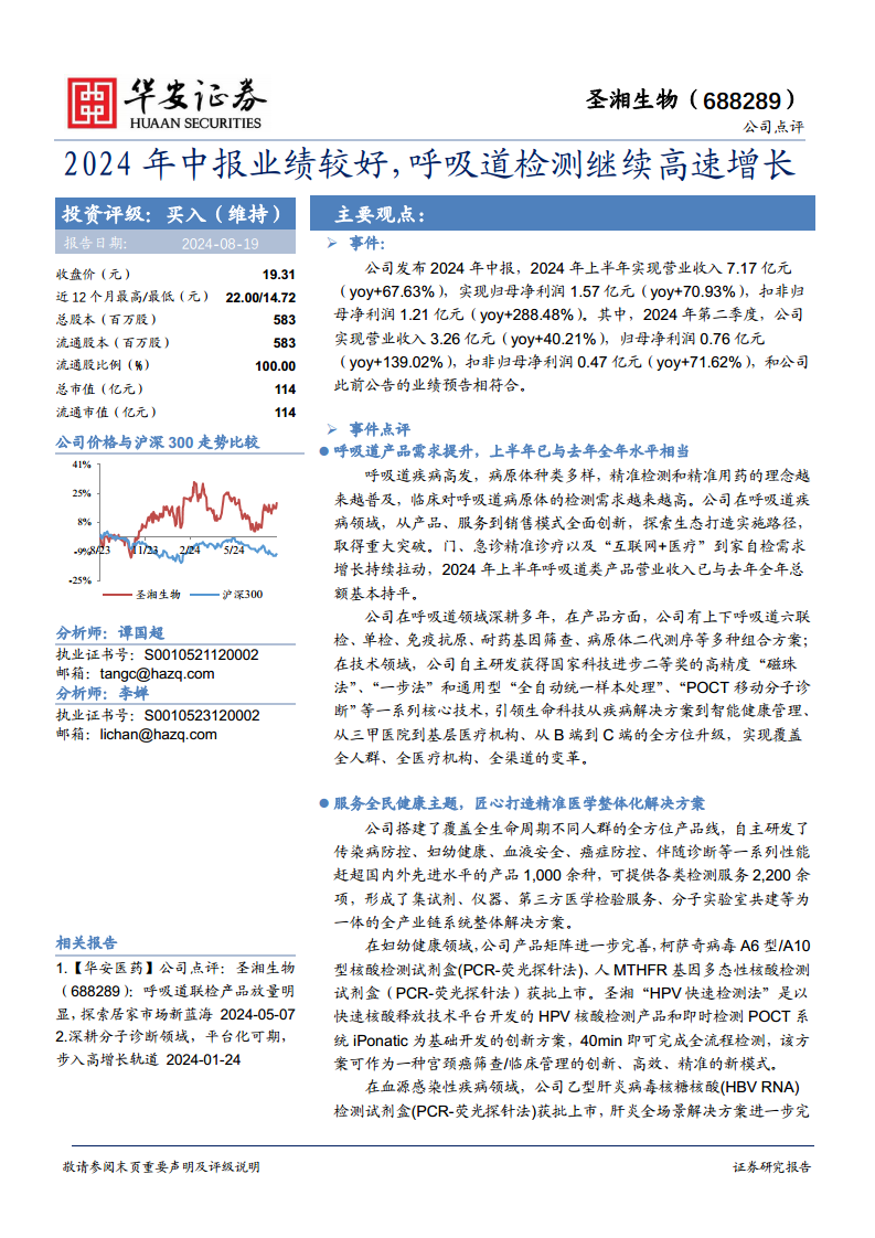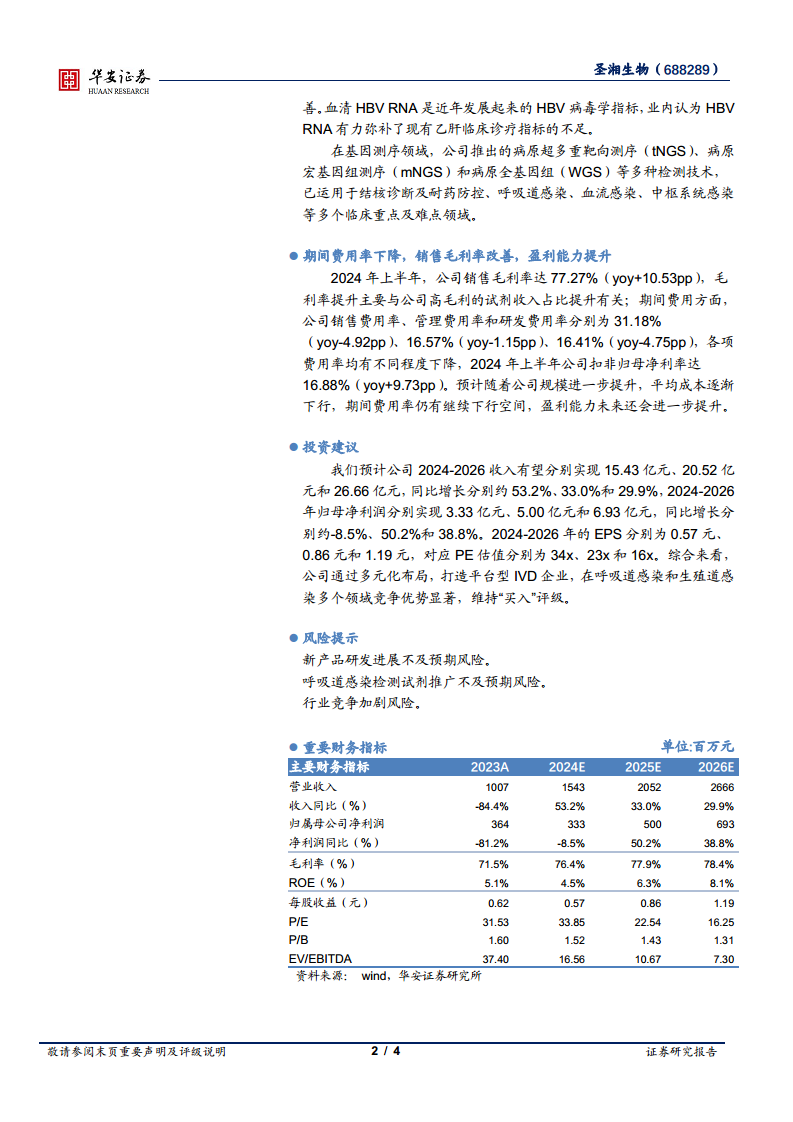 圣湘生物2024年上半年业绩表现亮眼,营收和净利润均实现大幅增长,其中呼吸道检测产品线表现尤为强劲,上半年收入已达到去年全年水平,成为核心增长引擎。公司通过持续创新和多元化布局,在呼吸道疾病、妇幼健康、血源感染性疾病和基因测序等多个关键领域构建了全面的精准医学整体化解决方案,展现了其作为平台型IVD企业的核心竞争力。同时,公司通过优化产品结构和精细化管理,有效控制了期间费用,显著提升了销售毛利率和净利率,盈利能力持续改善。展望未来,华安证券预计公司将保持稳健的收入和利润增长,并维持“买入”评级。尽管公司面临新产品研发、市场推广及行业竞争等潜在风险,但其多元化的业务布局和持续优化的盈利能力,为其长期发展奠定了坚实基础,有望在精准医疗市场中持续扩大份额。