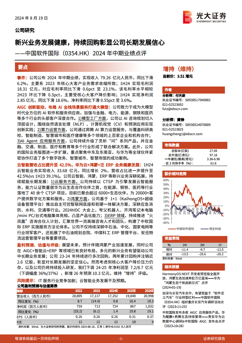 尽管公司未来增长潜力显著,但考虑到核心大客户降价压力依然存在,以及公司将持续投入研发,分析师下调了2024-2025年净利润预测至7.2亿元和8.7亿元(下调幅度分别为36%和37%),并新增2026年预测为10.3亿元。值得注意的是,公司在2023-2024年持续进行多次回购,两年累计回购并注销近2.6亿股,此举彰显了管理层对公司长期发展的坚定信心。基于上述分析,报告维持对中国软件国际的“增持”评级。
