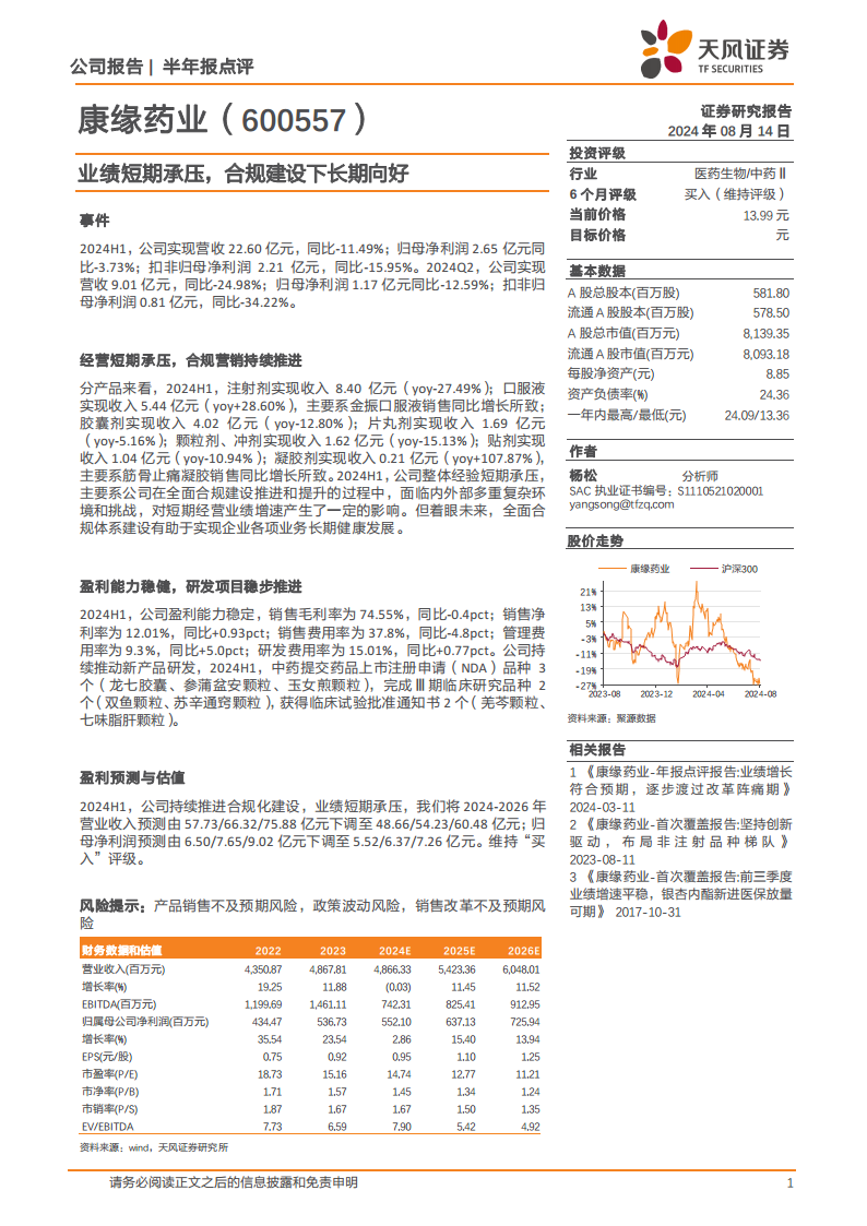 康缘药业2024年上半年业绩短期承压,营收和净利润均出现下滑,主要原因在于公司全面推进合规建设和营销改革。尽管如此,公司盈利能力保持稳健,销售毛利率和净利率稳定,且研发投入持续,多个新产品研发项目稳步推进。分析师基于合规建设对短期业绩的影响,下调了2024-2026年的营收和归母净利润预测,但仍维持“买入”评级,认为合规转型将为公司带来长期健康发展。投资者需关注产品销售、政策波动及销售改革进展等潜在风险。