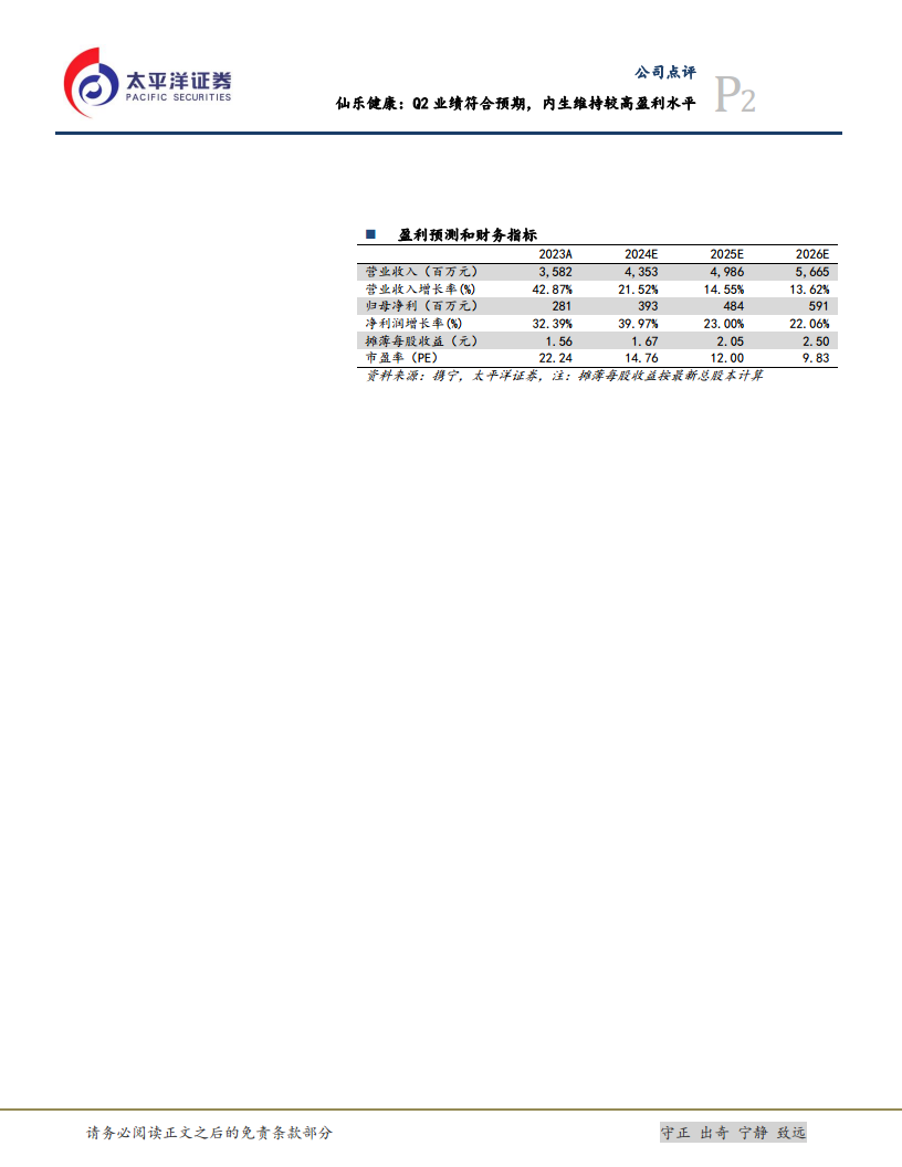 仙乐健康2024年上半年业绩表现强劲,第二季度符合市场预期,内生业务保持了较高的盈利水平。公司通过优化产品结构、精细化成本控制和积极的市场拓展策略,实现了营收和净利润的显著增长。特别是美洲和新兴市场贡献突出,BF子公司协同效应逐步显现并有望在下半年实现止亏。展望未来,公司在国内、欧洲和美洲市场均有明确的增长策略和新业务拓展计划,预计将持续推动业绩增长。太平洋证券维持其“买入”评级,并基于对未来业绩的乐观预期,给出了33.4元的目标价。投资者在关注公司增长潜力的同时,也需留意食品安全、市场竞争、原材料成本、BF盈利及汇率波动等潜在风险。
