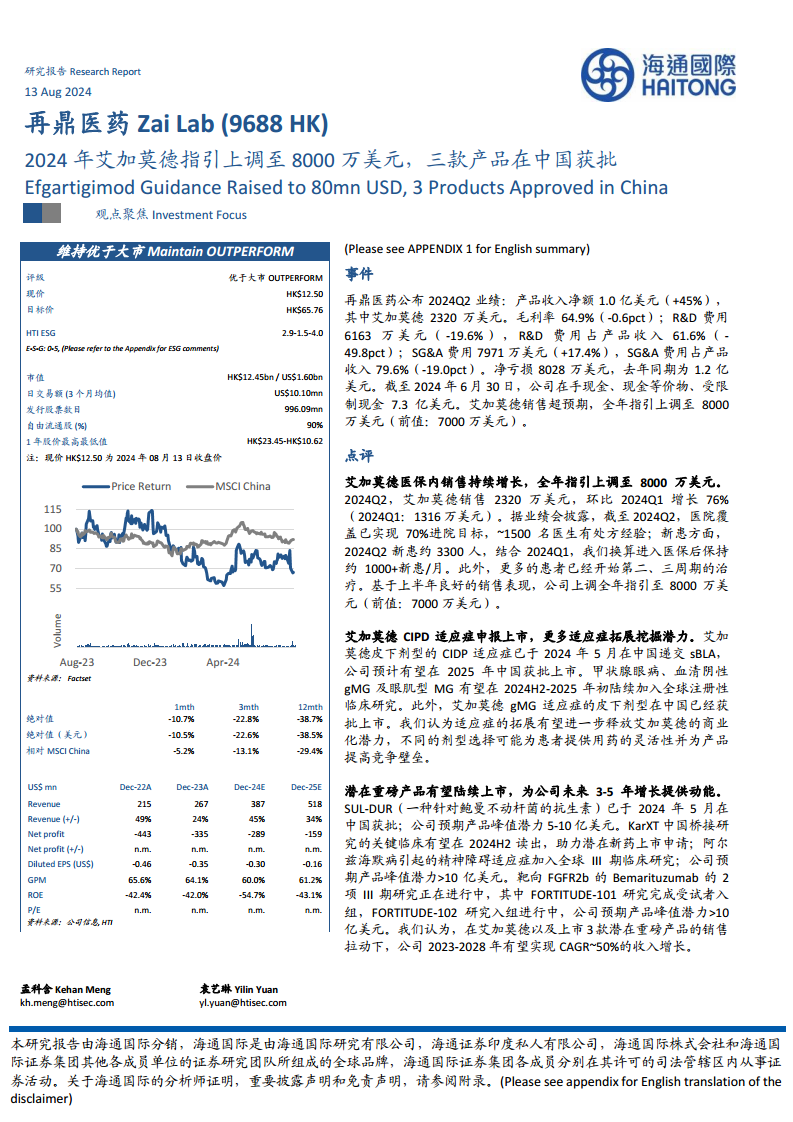 再鼎医药(09688):2024年艾加莫德指引上调至8000万美元,三款产品在中国获批