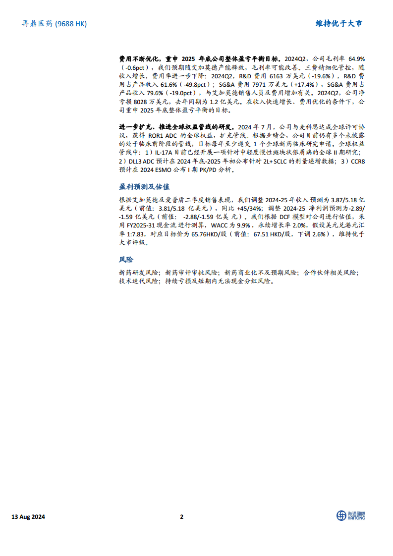 基于艾加莫德和爱普盾的二季度销售表现,分析师调整了2024-2025年收入预测至3.87亿美元和5.18亿美元(前值分别为3.81亿美元和5.18亿美元),同比分别增长45%和34%。净利润预测调整为-2.89亿美元和-1.59亿美元(前值分别为-2.88亿美元和-1.59亿美元)。采用DCF模型进行估值,基于2025-2031年现金流测算,WACC为9.9%,永续增长率为2.0%,假设美元兑港元汇率为1:7.83,对应目标价为65.76港元/股(前值67.51港元/股,下调2.6%),维持“优于大市”评级。