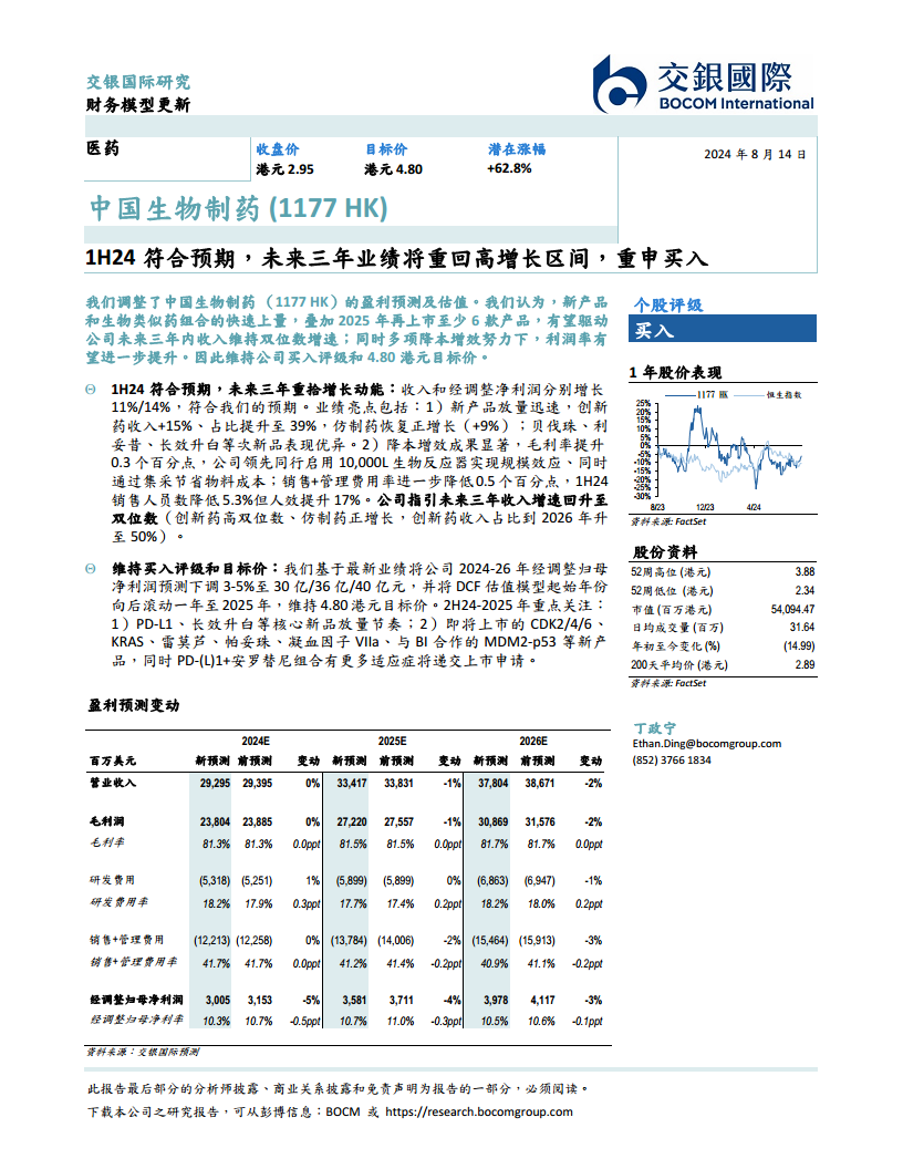 中国生物制药(01177):1H24符合预期,未来三年业绩将重回高增长区间,重申买入
