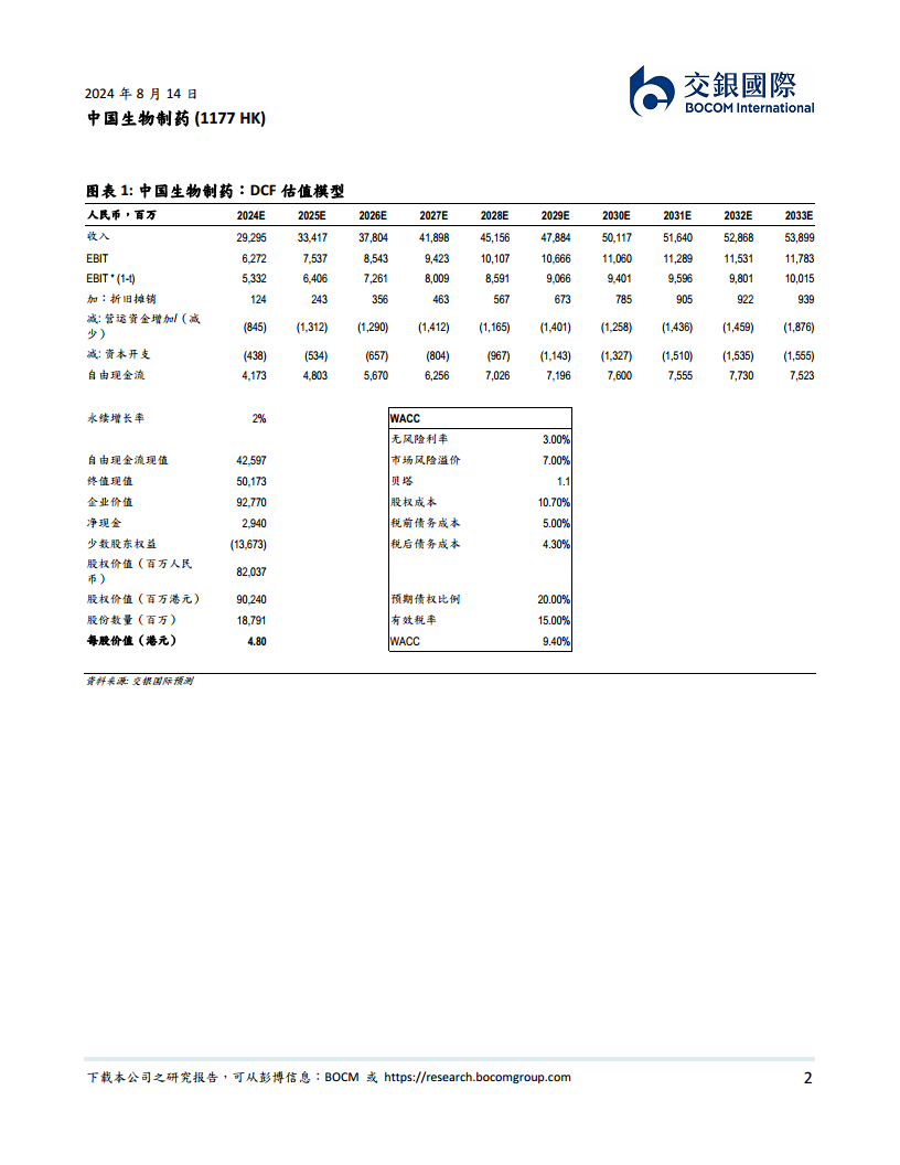 基于对公司未来增长潜力的信心,交银国际维持对中国生物制药的“买入”评级,并重申4.80港元的目标价。该目标价相较于当前收盘价2.95港元,具有62.8%的潜在涨幅,反映了分析师对公司长期价值的积极展望。尽管对2024-2026年的经调整归母净利润预测进行了小幅下调(3-5%),但DCF估值模型显示公司股权价值稳健,每股价值仍为4.80港元。