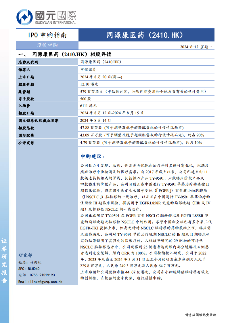 同源康医药-B(02410):IPO申购指南