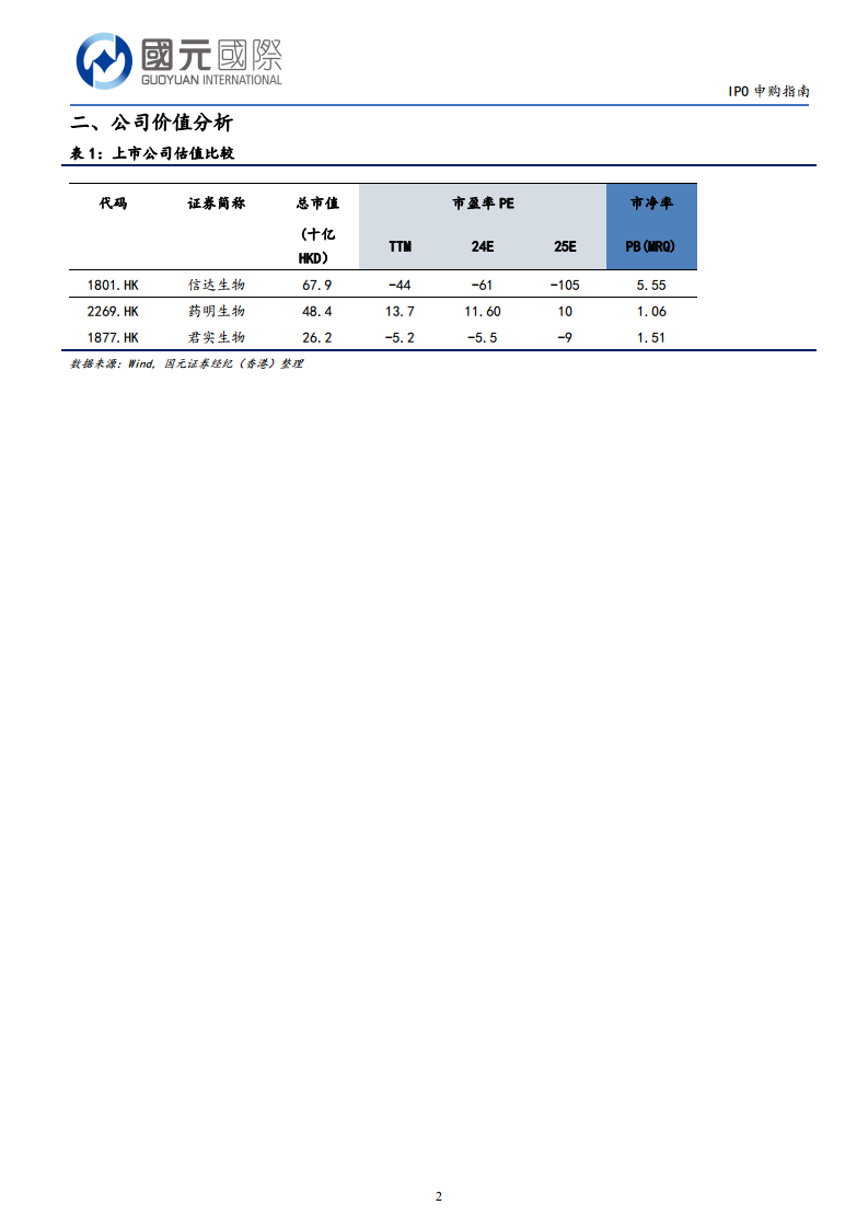 报告提供了三家已上市生物科技公司的估值数据作为参考: