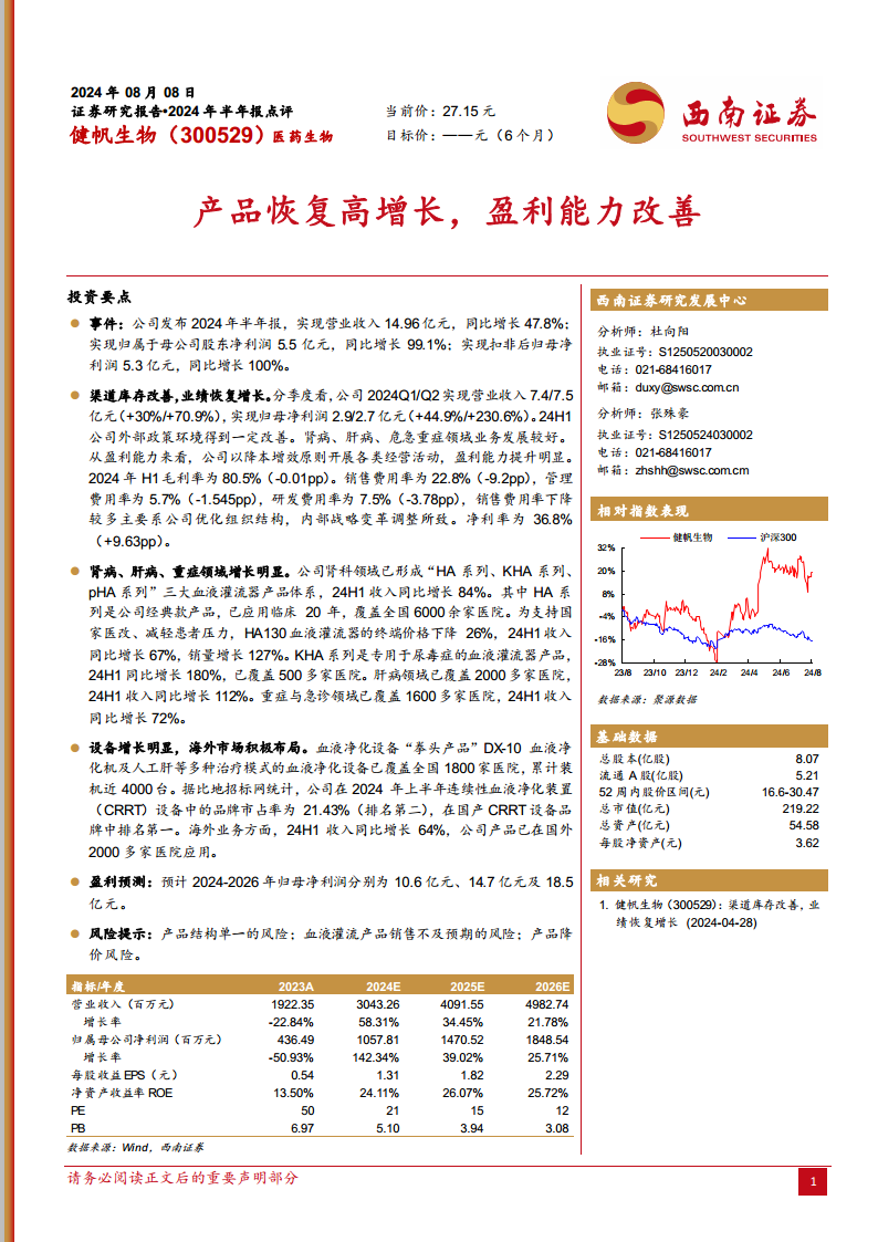 健帆生物2024年上半年业绩表现强劲,营业收入和净利润均实现高速增长,标志着公司在经历调整期后已全面恢复增长态势。这主要得益于公司在渠道库存管理、外部政策环境适应以及内部降本增效方面的显著成效,使得盈利