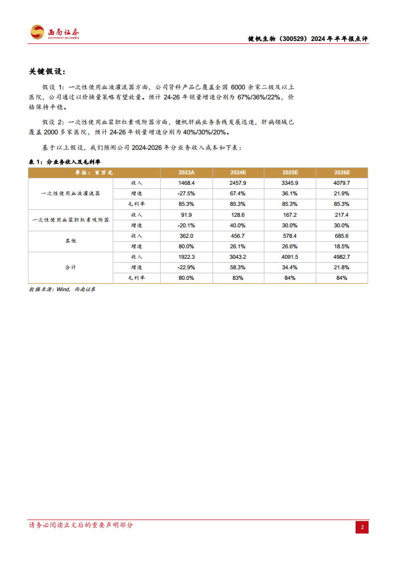 盈利预测的建立基于以下关键假设:一次性使用血液灌流器方面,预计2024-2026年销量增速分别为67%、36%和22%,价格保持平稳,毛利率维持在85.3%。一次性使用血浆胆红素吸附器方面,预计2024-2026年销量增速分别为40%、30%和30%。这些假设反映了公司通过“以价换量”和市场渗透策略实现业务增长的信心。