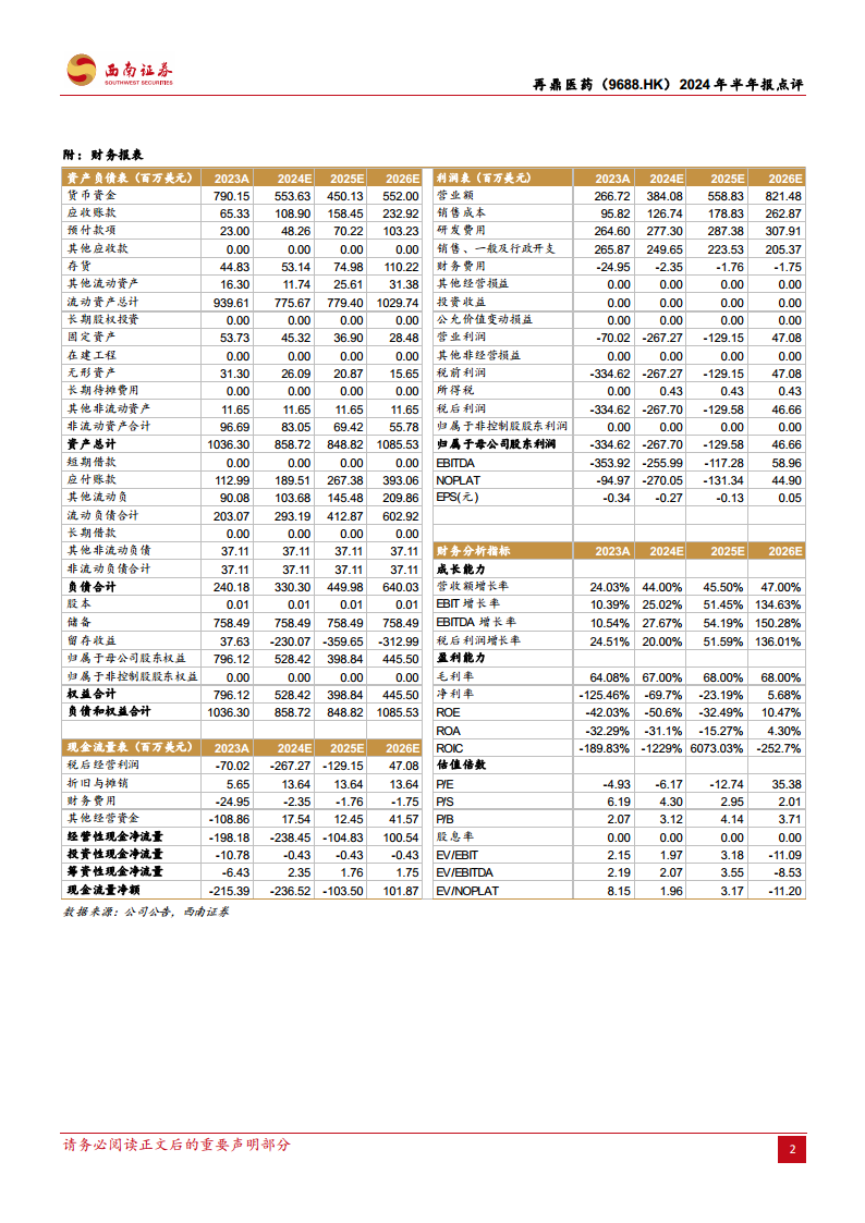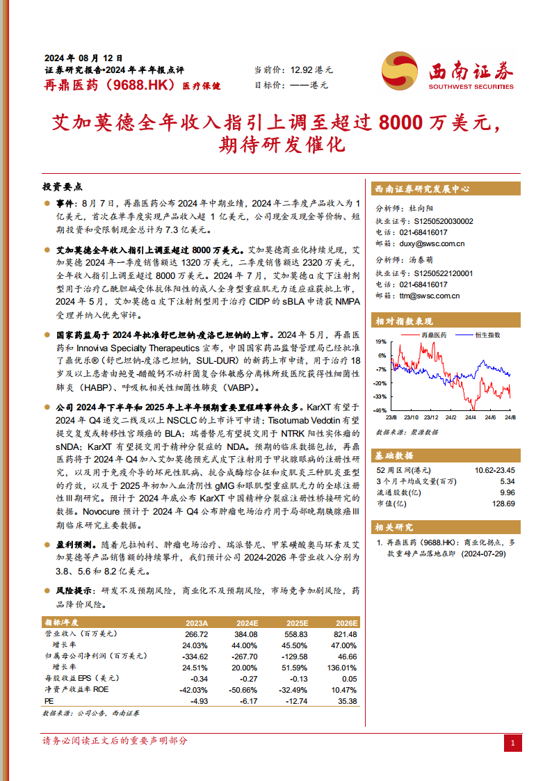 再鼎医药2024年上半年表现强劲,第二季度产品收入首次突破1亿美元,艾加莫德全年收入指引上调至超过8000万美元,显示出核心产品的商业化成功。同时,鼎优乐®的获批上市进一步丰富了产品管线。展望未来,公司在研管线密集,多款重磅产品有望在未来半年至一年内提交上市申请或公布关键临床数据,为公司带来持续的增长催化剂。财务预测显示,随着产品销售额的持续增长,公司营收将稳步提升,并有望在2026年实现盈利,整体发展前景积极。