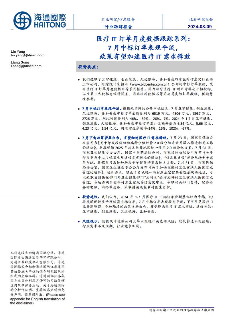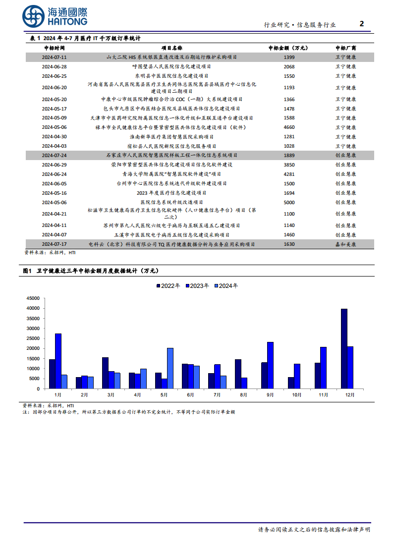医疗IT订单月度数据跟踪系列:7月中标订单表现平淡,政策有望加速医疗IT需求释放