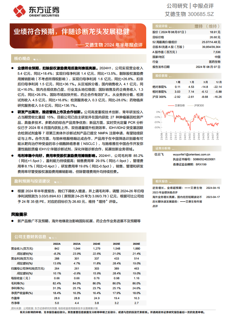 基于2024年半年度报告,分析师下调了收入增速预测,但上调了毛利率预测。调整后,2024-2026年归母净利润预测分别为3.03亿元、3.89亿元和4.63亿元(原预测2024-2025年为3.06亿元和3.78亿元)。根据可比公司估值,给予艾德生物2024年35倍PE,对应目标价为26.60元。维持“增持”评级。报告提示了新产品推广不及预期、海外地缘政治影响国际拓展以及药企合作业务进展不及预期等潜在风险。