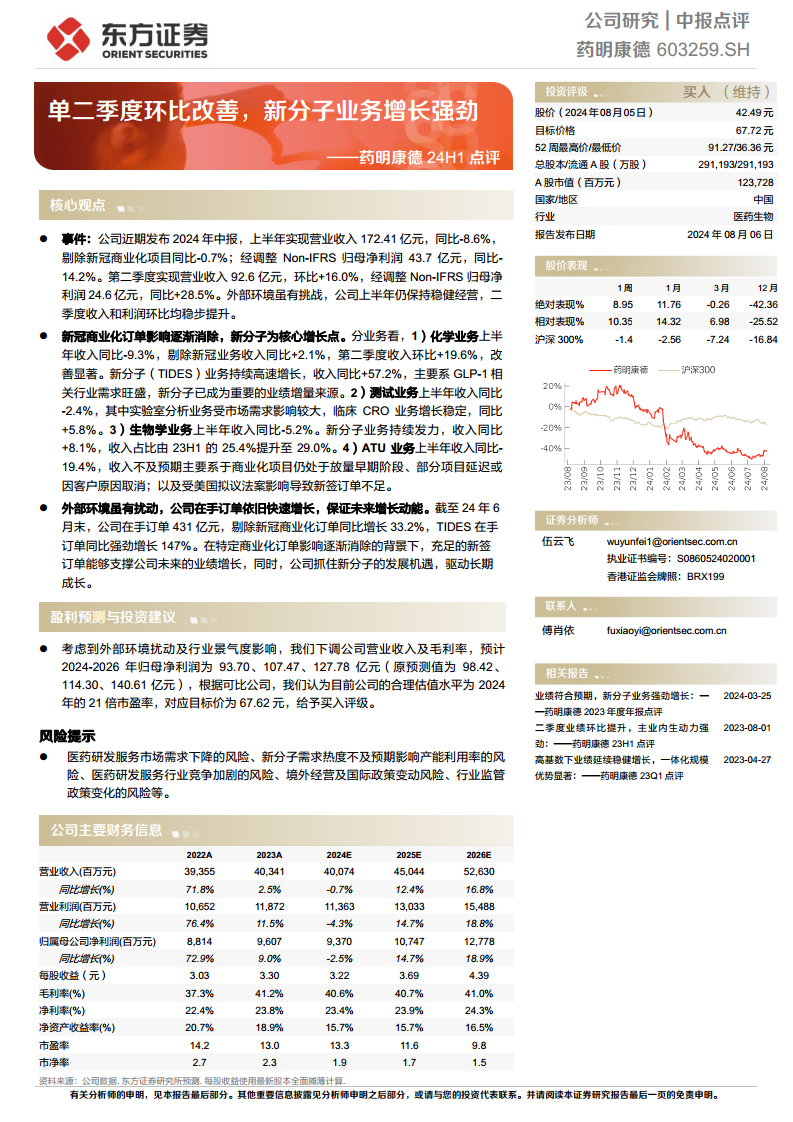药明康德在2024年上半年展现出显著的经营韧性,尤其在第二季度实现了营收和利润的环比大幅改善。尽管受到新冠商业化项目退出和外部环境挑战的影响,公司通过战略性聚焦新分子业务(TIDES),成功将其培育成核心增长引擎,该业务在化学和生物学板块均实现强劲增长,并受益于GLP-1等新兴需求。公司在手订单持续快速增长,特别是TIDES在手订单同比激增147%,为未来业绩提供了坚实保障。尽管分析师下调了盈利预测以反映外部环境的审慎评估,但基于公司强大的创新能力、充足的订单储备和在新分子领域的领先优势,东方证券研究所维持“买入”评级,并设定目标价67.62元,表明对公司长期增长潜力的信心。
