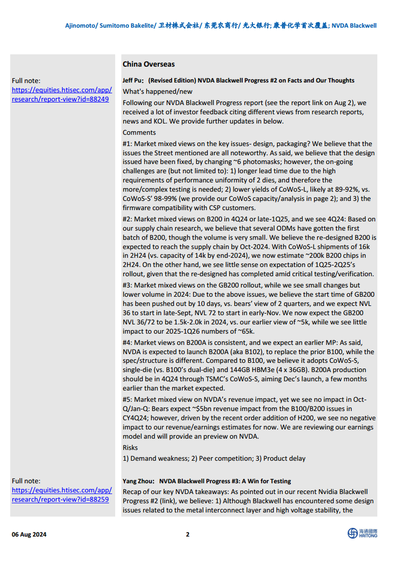 - B200/GB200出货预测: 尽管存在上述问题,供应链研究显示首批B200芯片已交付ODM,重新设计的B200预计2024年10月进入供应链。预计2024年下半年CoWoS-L出货量为1.6万颗,B200芯片出货量约20万颗。GB200 NVL 36/72的启动时间推迟约10天,预计2024年出货量下调至1.5k-2.0k(原预计约5k),但对2025-2026年约6.5万颗的出货量影响不大。