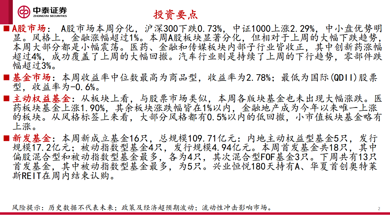 本周A股市场呈现结构性分化,中小盘股表现突出,创新药板块领涨,而汽车行业持续承压。基金市场整体波动较小,商品型基金表现最佳,主动权益基金中医药板块表现亮眼,金融地产成为今年以来唯一上涨的板块。新基金发行市场保持活跃,本周新成立基金总规模超百亿,偏股混合型和被动指数型基金是发行主力,预计下周被动指数型基金仍将是新发市场的重要组成部分。投资者需关注市场分化趋势,并警惕政策、经济超预期波动及流动性冲击等风险。