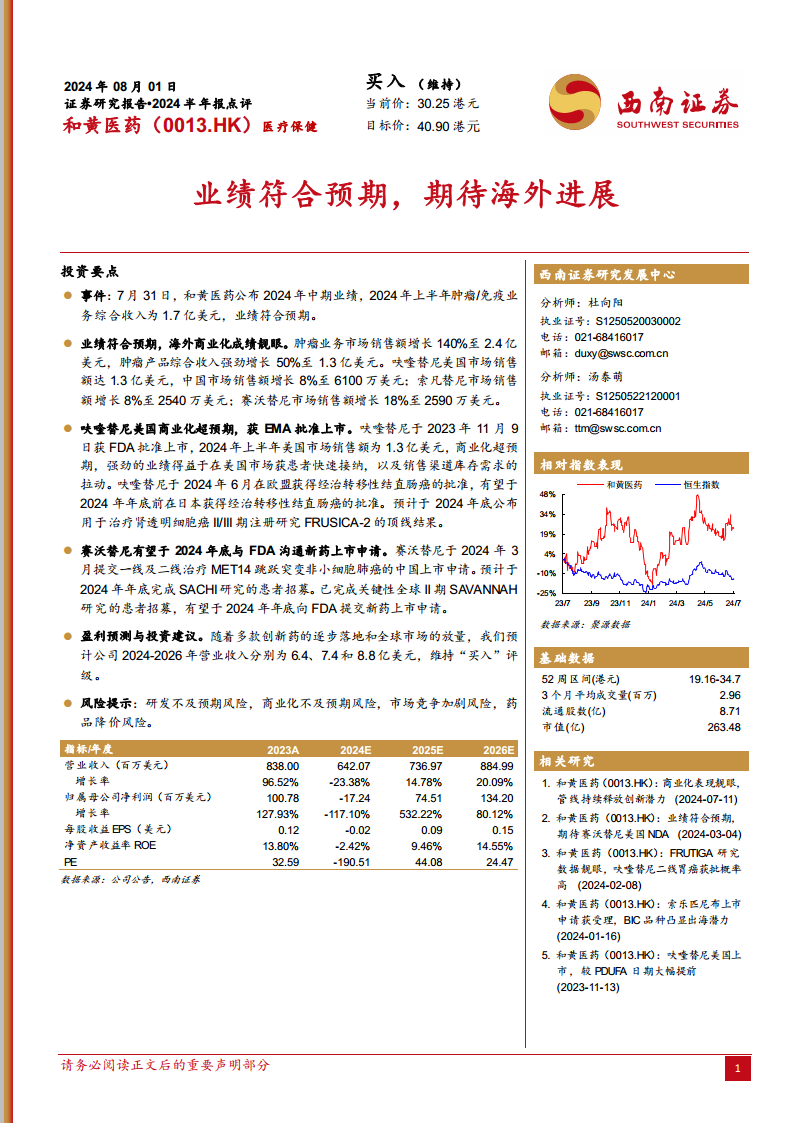 和黄医药2024年上半年业绩符合预期,肿瘤/免疫业务综合收入达到1.7亿美元,其中海外商业化表现尤为突出,呋喹替尼在美国市场销售额达1.3亿美元,远超预期。公司在创新药全球化布局方面取得显著进展,呋喹替尼已获欧盟EMA批准,并有望在日本获批;赛沃替尼也计划于2024年底向FDA提交新药上市申请。报告基于对呋喹替尼、赛沃替尼和索凡替尼等核心产品的关键假设,预测公司2024-2026年营业收入将持续增长,并预计在2025年和2026年实现净利润的强劲反弹。尽管存在研发和商业化风险,但鉴于公司强大的研发实力和全球市场拓展潜力,维持“买入”评级,目标价40.9港元。财务数据显示,公司在经历2024年的短期调整后,盈利能力和资本回报率预计将显著改善,估值相对于同业具有吸引力。
