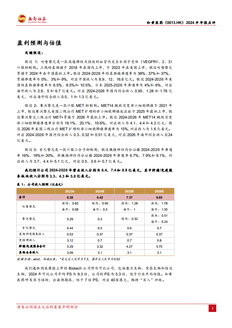 基于多款创新药的逐步落地和全球市场的放量,西南证券研究发展中心对和黄医药的未来业绩持乐观态度。预计公司2024年至2026年的营业收入将分别达到6.4亿美元、7.4亿美元和8.8亿美元。鉴于公司强劲的增长潜力和全球化布局,报告维持对和黄医药的“买入”评级。