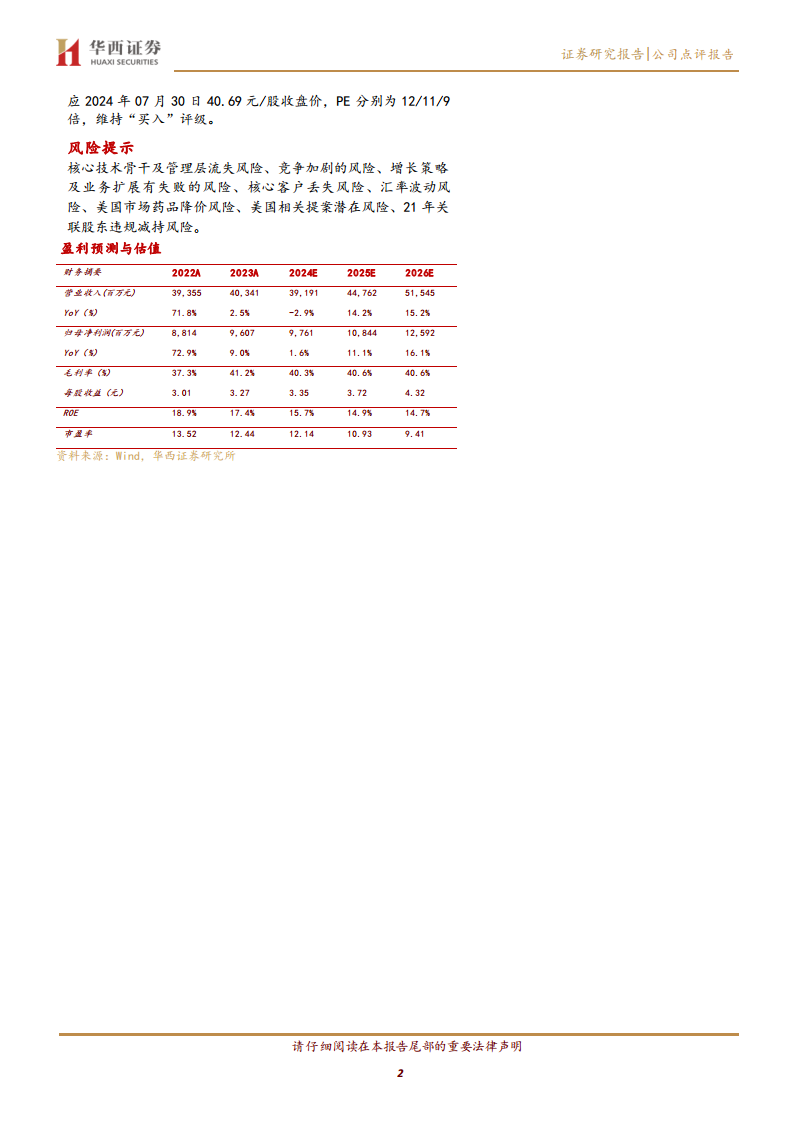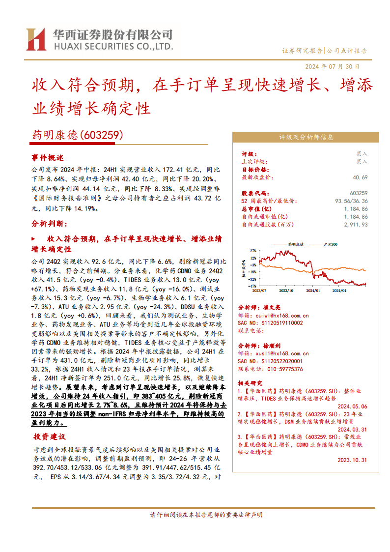 药明康德2024年上半年业绩显示,尽管营收符合预期但归母净利润有所下滑,主要受全球投融资环境和美国相关提案影响。然而,公司在手订单和净新签订单(剔除新冠项目后)均实现快速增长,特别是TIDES业务表现强劲,为未来业绩增长提供了坚实基础。公司维持全年收入指引,并预计将保持较高的盈利能力。鉴于订单的快速增长和持续的降本增效措施,分析师维持“买入”评级,并对未来盈利能力持乐观态度,但同时提示了核心技术骨干流失、竞争加剧、客户丢失以及美国相关提案等潜在风险。