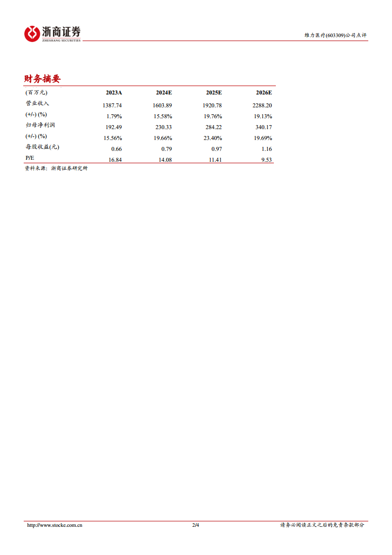 基于公司作为国内医用导管龙头企业的市场地位和强大的产品出海竞争力,以及其所处的快速发展阶段,分析师预计公司2024年至2026年的每股收益(EPS)分别为0.79元、0.97元和1.16元。当前股价对应的市盈率(PE)分别为14.1倍、11.4倍和9.5倍。鉴于上述分析,报告维持对维力医疗的“增持”投资评级。同时,报告提示了潜在风险,包括政策变化风险、海外销售不确定风险以及市场竞争加剧风险。