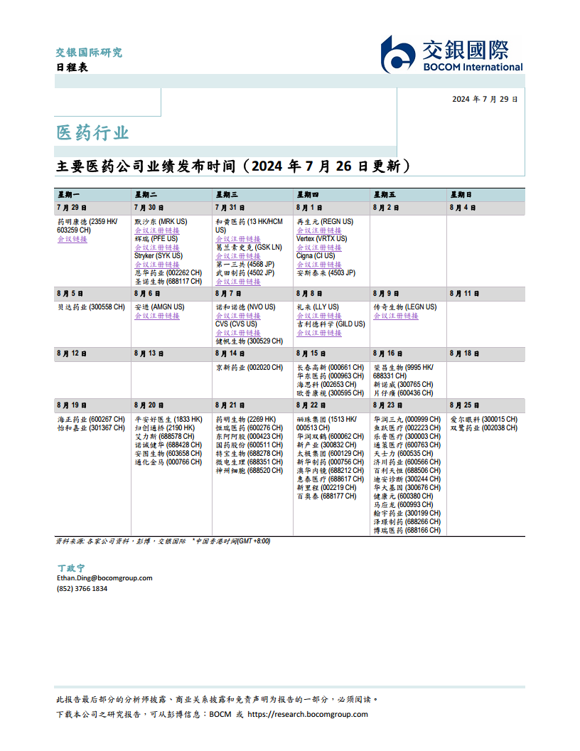 主要医药公司业绩发布时间(2024年7月26日更新)
