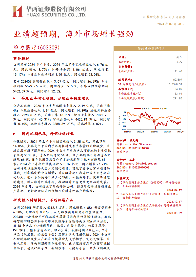 维力医疗2024年上半年业绩表现超出预期,特别是第二季度实现了营收和净利润的强劲增长。这主要得益于公司海外市场的显著扩张和本土化战略的深入推进,有效弥补了国内市场短期承压带来的影响。导尿和护理业务表现突出,成为公司业绩增长的重要驱动力。同时,公司持续加大研发投入,不断丰富产品线,并成功获得多项国内外产品注册认证,为未来发展积蓄了动能。尽管面临国内市场挑战和国际形势等风险,但鉴于公司在海外市场的强劲表现和持续的研发创新,分析师维持了“买入”评级,并对未来盈利能力持乐观态度。